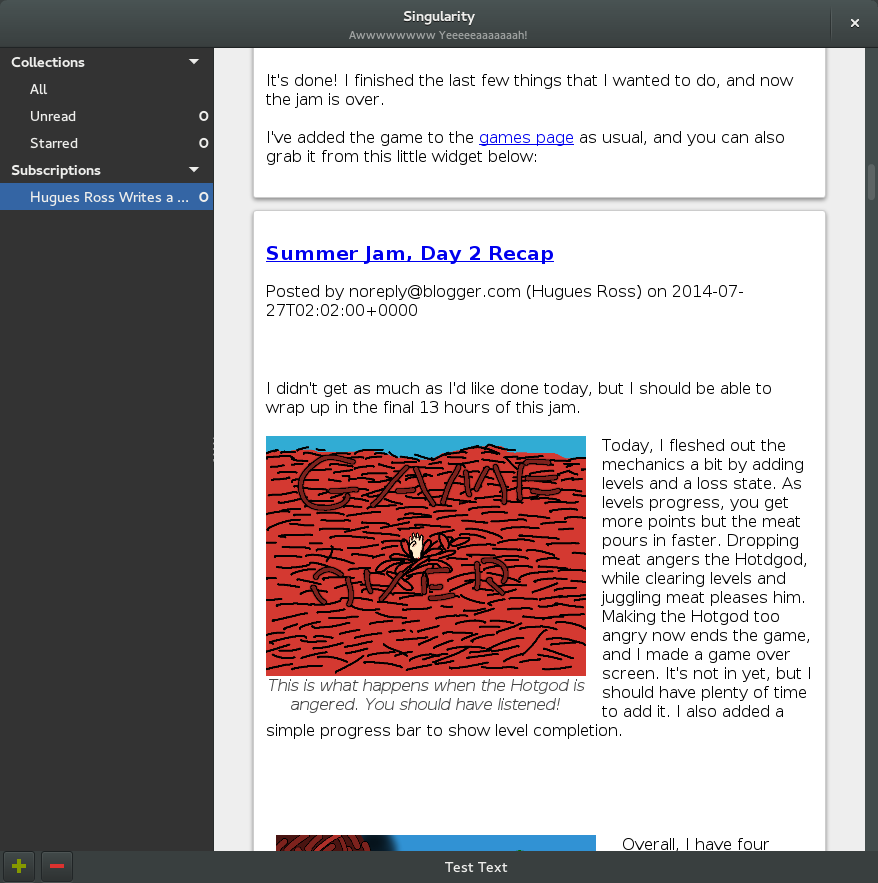 Singularity is a simple GTK-based RSS reader. Development was started when Google first announced that Google Reader was being shut down. The project has come a long way since then, with 3 major releases(although this is the first public one), each one featuring a codebase rewrite. The first release, 1.0, was little more than a basic proof of concept. The entire app spanned only two code files, was filled with strange and arcane workarounds to simple problems, and was developed in a very short span of time. Regardless, it did its job(somehow). Afterwards, I felt the need to try and turn Singularity into a halfway decent piece of work. This led to version 1.5, released fairly soon after the 1.0 release. This version was much better than the last, and is the longest-used version so far. However, it wasn't very well designed, had a fairly large number of issues and missing features, and slowly acquired quite a bit of cruft. When I revisited the project this summer, I considered working with the code that I had. However, After spending some time reviewing it I decided it was best to get a fresh start. To that end, I rewrote the whole thing again, and even rolled the version number back to 0.1. That brings us to today. I've used 0.1 for a couple of weeks, even as development continued, and I think I can safely say that it doesn't have any massive issues. There are still bugs, and there's much more to be done, but it's a decent start.