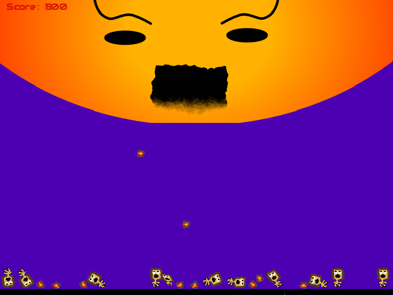 Here's my game so far, which I've affectionately named 'ANGRY SUN AAAAAARGHHHH!!' The sun has gotten tired of setting, and now it's taking vengeance on humankind. So far, there's no way to win or lose, just fire big molten rocks at random civilians and rack up points. I might keep it that way.