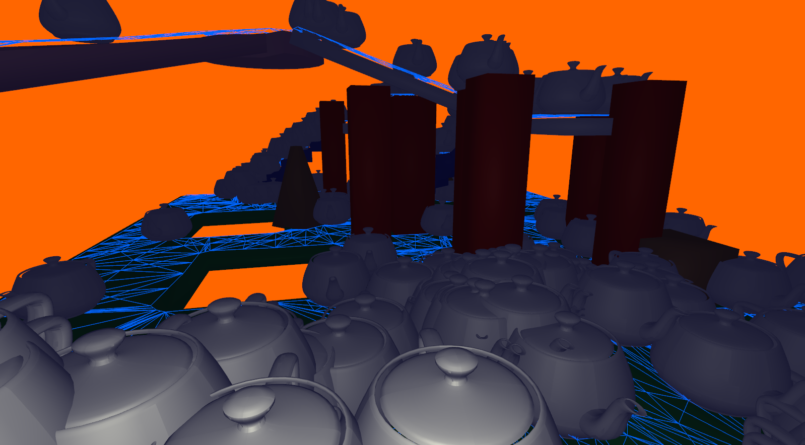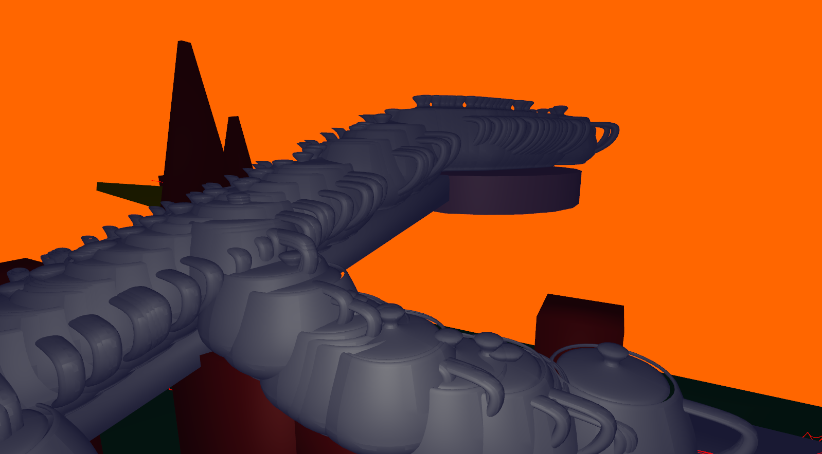 | As you may know,the teapot model in our project is an old favorite known as the 'Utah Teapot.' If you know what it is, it should be pretty obvious why it was used. However, the fun part comes when you consider the context. The teapots are AI agents that need to path to a specific location, in our case the camera, and so we ended up with the strange situation of being followed by a group of strangely intelligent teapots! The nature of the assignment also lead to a few odd visuals, like these teapot centipedes: