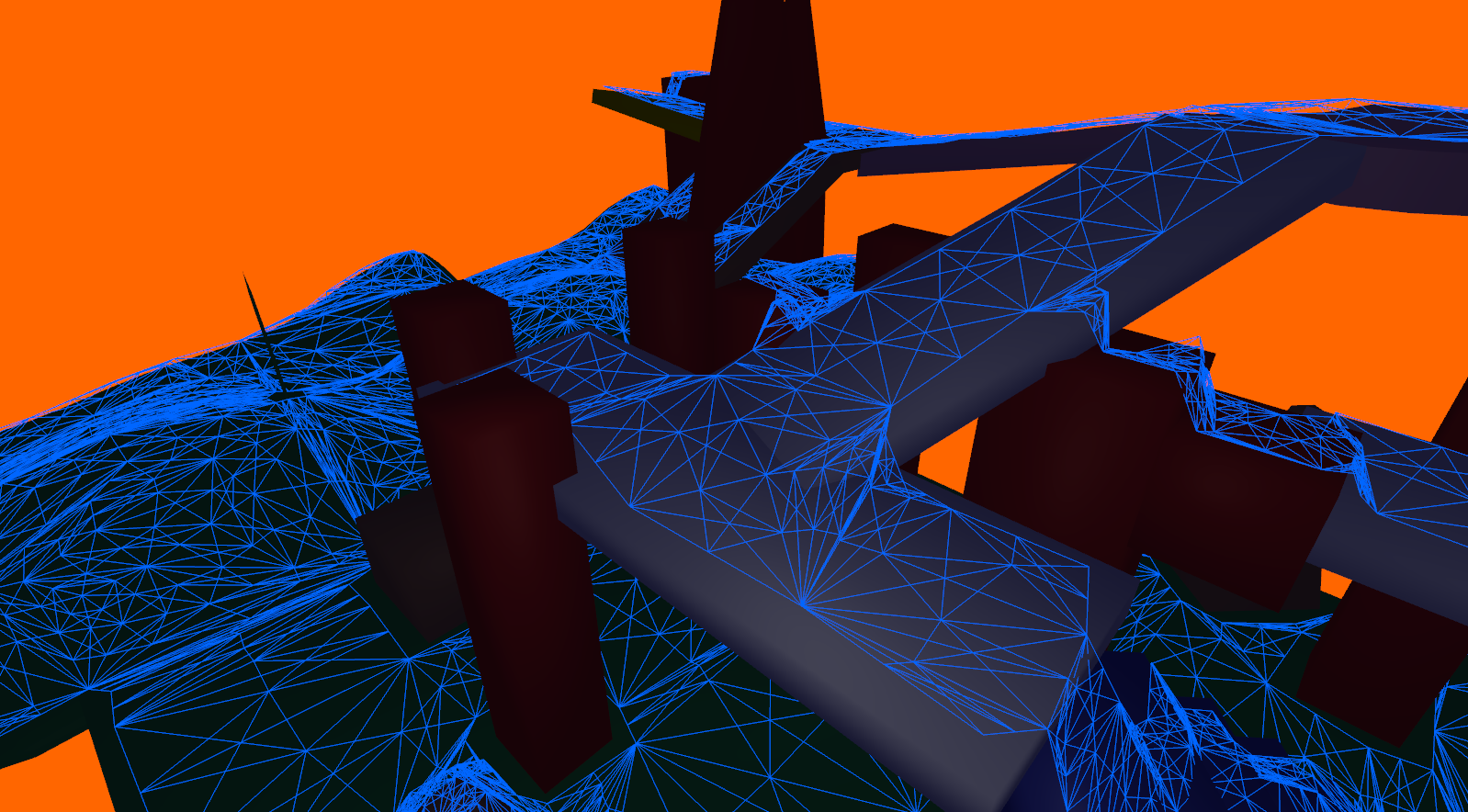 For our main technique, we looked at using navigation meshes to generate pathfinding graphs from 3D environments. To create the navmesh, we used Recast, a peice of open-source middleware. If you look below, you can see screenshots showing the test mesh with and without the pathfinding graph displayed: